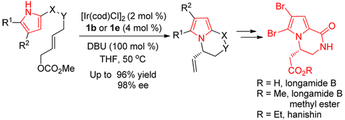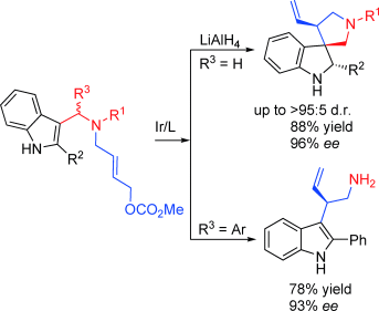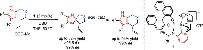 12. Asymmetric dearomatization of pyrroles via Ir-catalyzed allylic substitution reaction: enantioselective synthesis of spiro-2H-pyrroles.