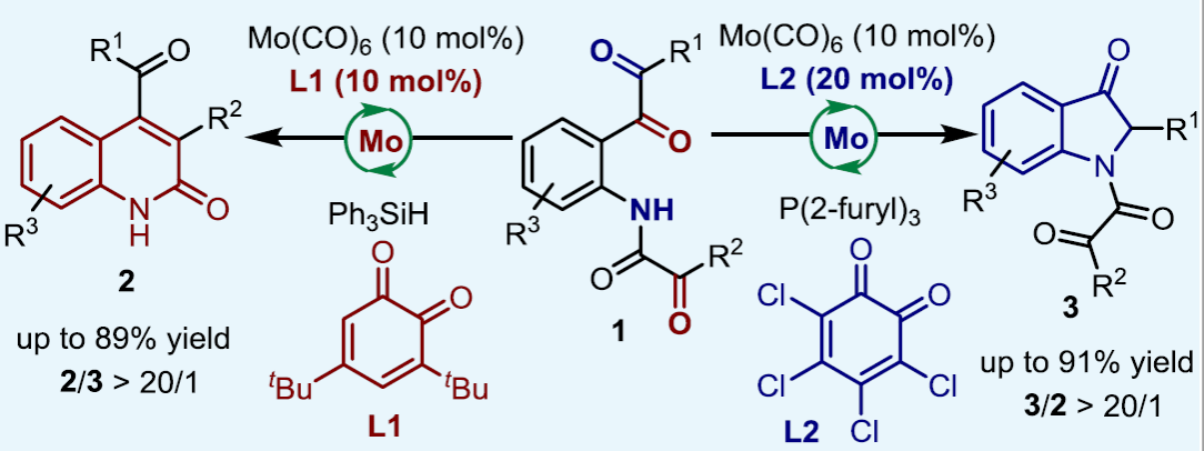 37. Divergent synthesis of 2-quinolinones and indolin-3-ones via Mo-catalyzed controllable carbonyl deoxygenative coupling and formal deoxygenative N—H insertion reactions.